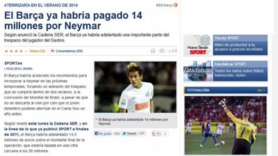 Προκαταβολή για την απόκτηση του Νεϊμάρ φέρεται να έχει καταβάλει η Μπαρτσελόνα, σύμφωνα με δημοσιεύματα του ισπανικού Τύπου. Συγκεκριμένα, ο ραδιοφωνικός σταθμός «Cadena SER» και μέσα στο 2011 η εφημερίδα «Sport» υποστηρίζουν ότι οι Καταλανοί έχουν δώσει ήδη 14 εκατ. ευρώ στην Σάντος από τα 58 εκατ. ευρώ που θα φτάσει το κόστος της μεταγραφής του Βραζιλιάνου επιθετικού.